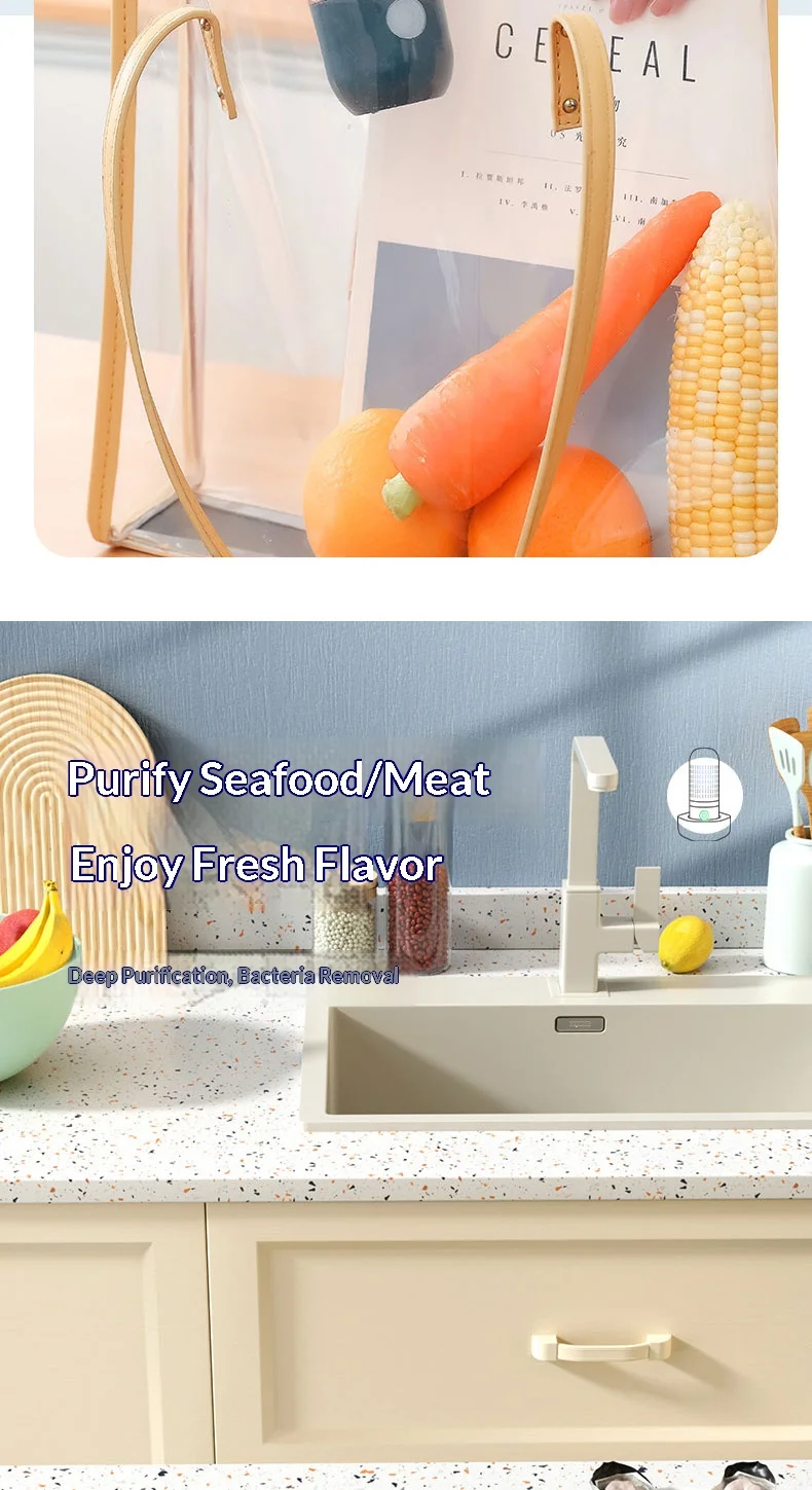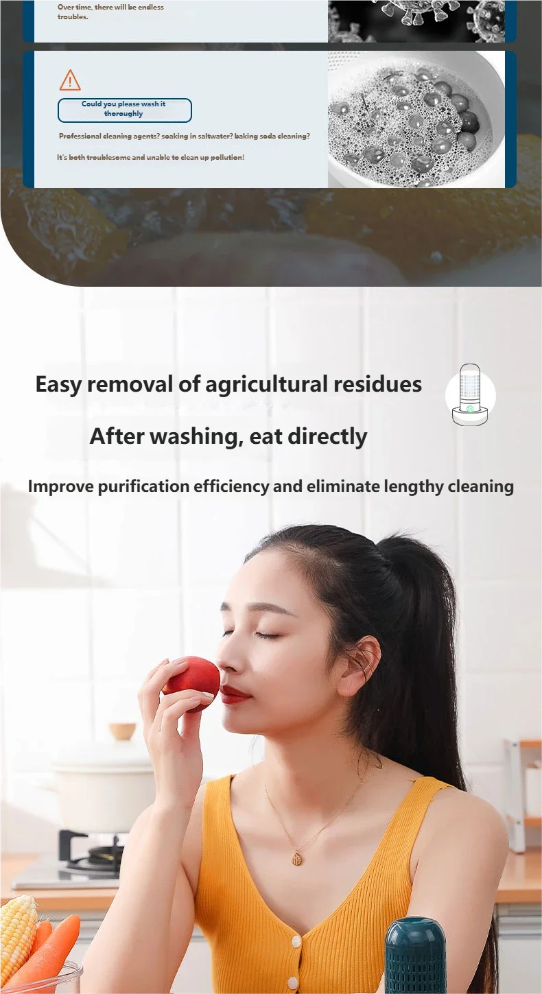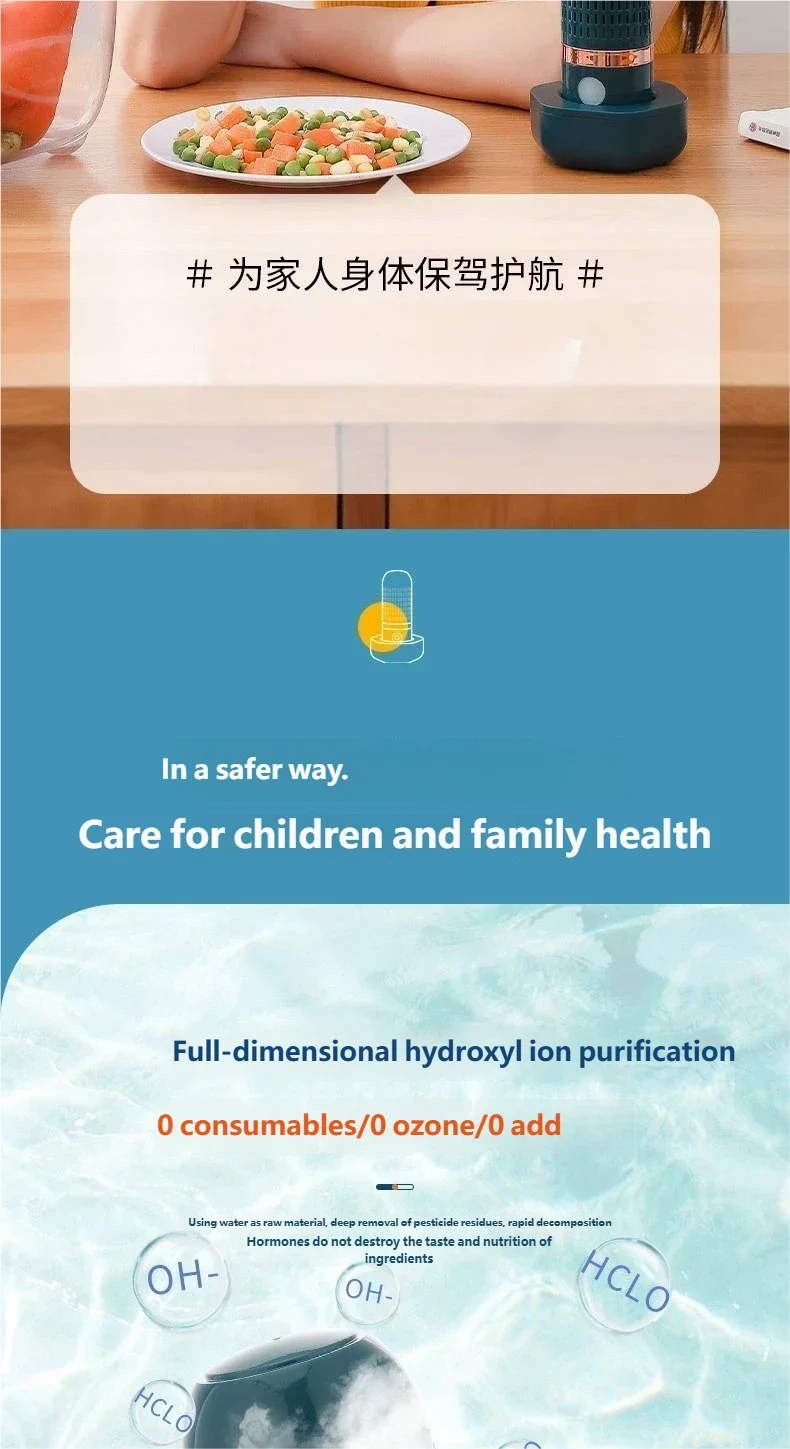 3. Safe and Efficient: Food purifier is waterproof and leak-proof for safe use. It utilizes water as a resource to deeply remove pesticide residues and quickly decompose hormones without disrupting the taste and nutrition of food.