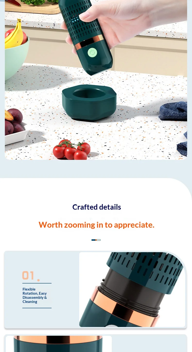 4. Portable and Convenient: Fruit vegetables washing cleaners compact design makes it ideal for business trips or camping, and outdoor travels. It features flexible rotation for easy disassembly and cleaning, helping to keep food fresh.