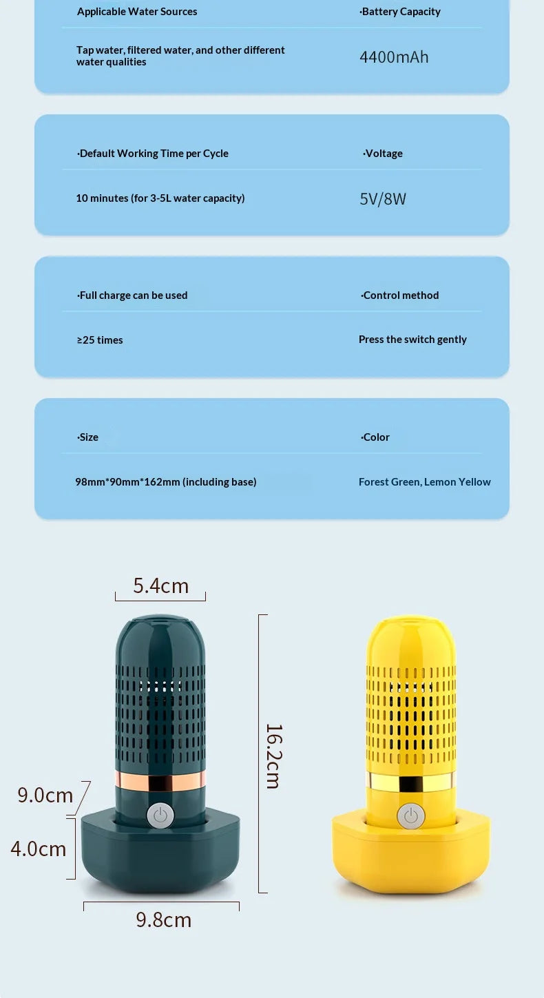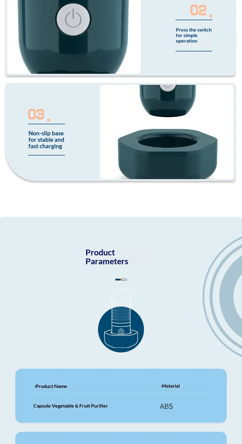 2. Powerful Battery: Fruit and vegetable cleansing capsule comes equipped with a built-in 3000mAh rechargeable battery. With USB charging, you can get approximately 25 uses on a full charge.